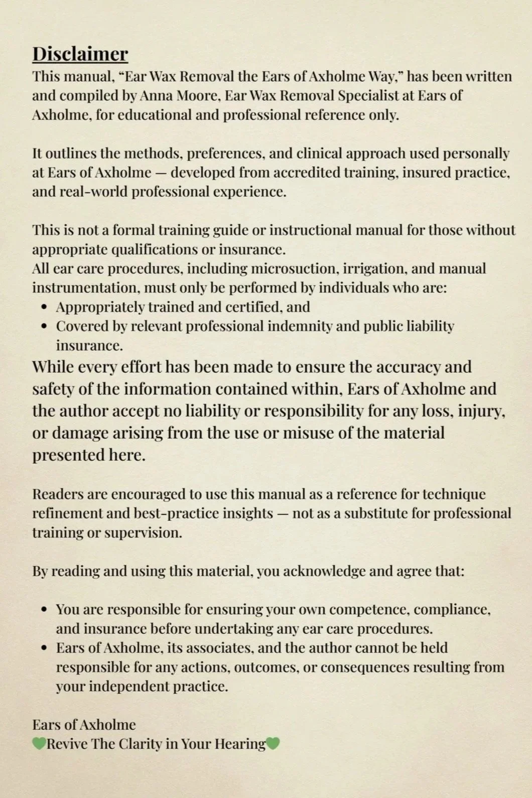 This manual is designed to teach the Ears of Axholme approach to ear wax removal — a blend of clinical precision, patient comfort, and professional pride. Whether you’re a trainee learning the art of microsuction or an experienced practitioner looking to refine your technique, this guide will help you perfect “the Axholme touch.”